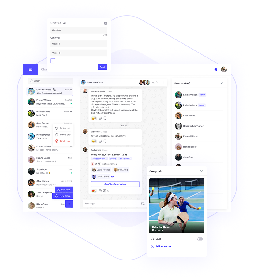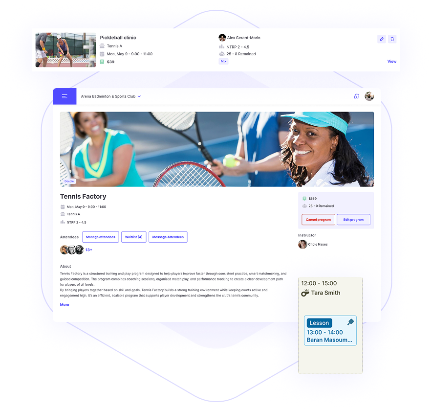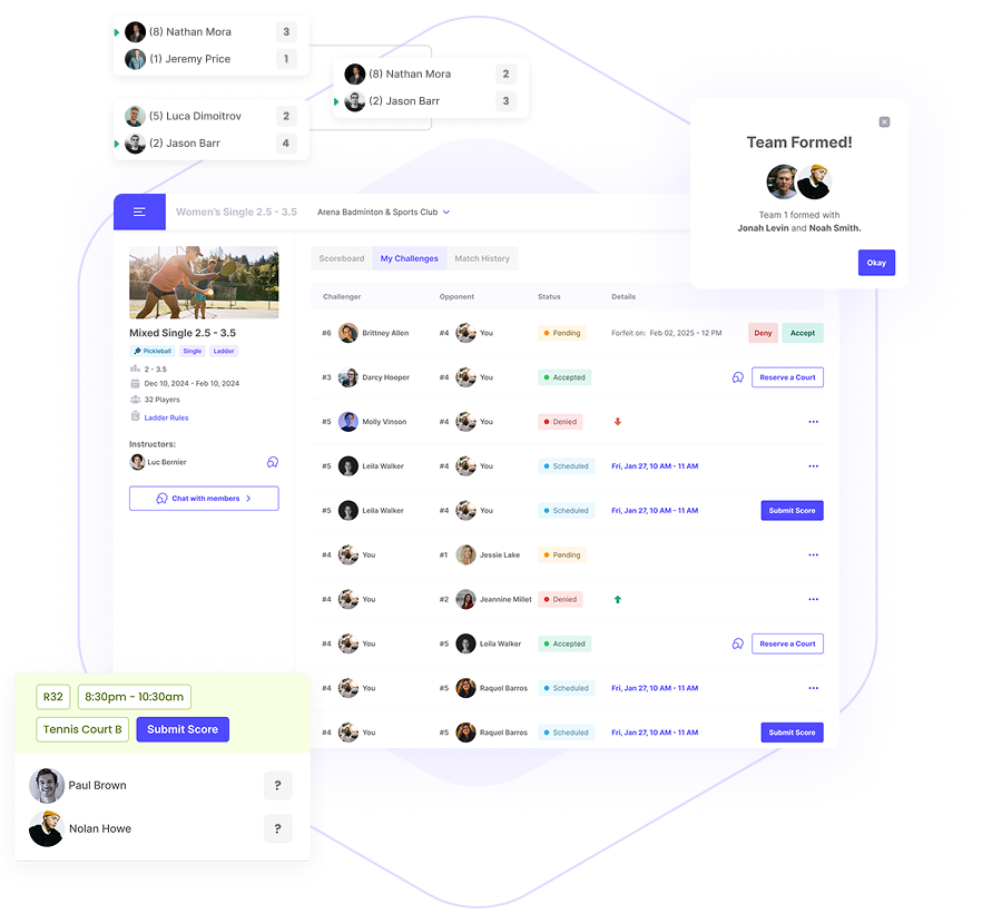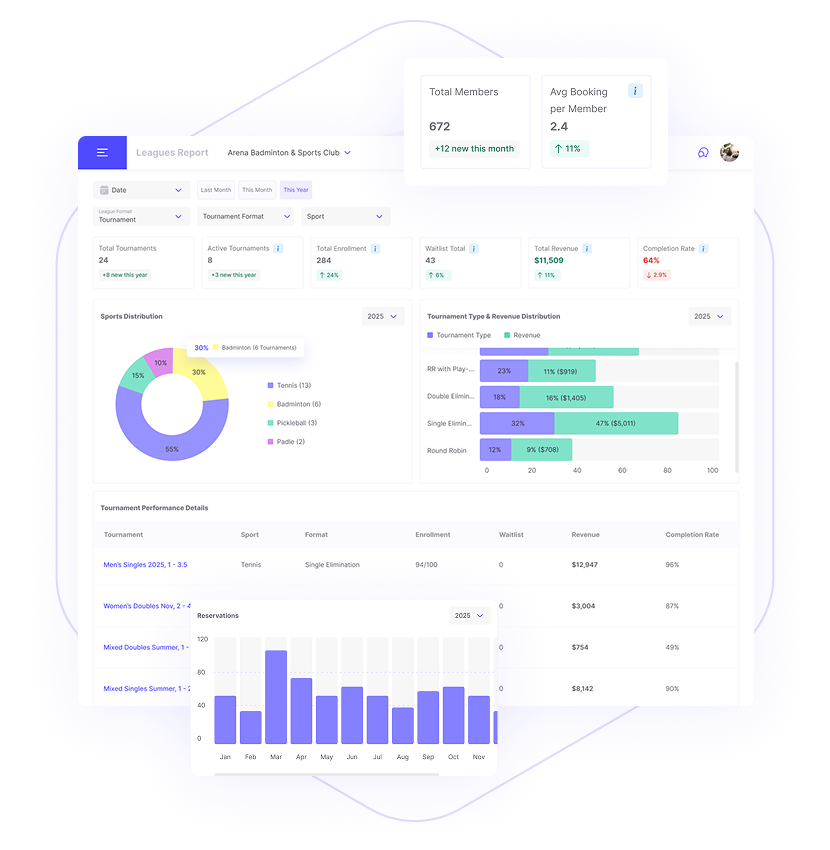 Everything Your Club Needs in One Place CourtMatch unifies reservations, memberships, programs, communication, and insights in one seamless platform that keeps your club running and your members engaged.